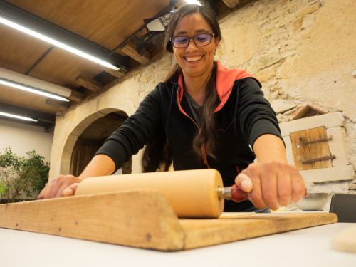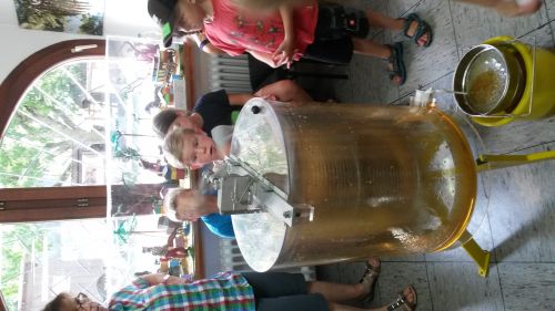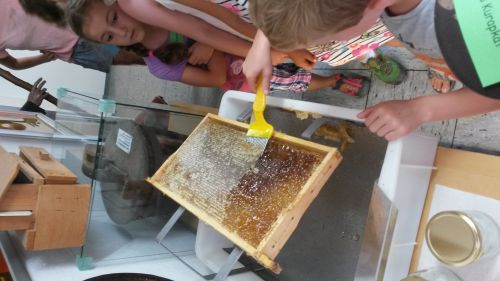 Das Highlight der Führung war die Herstellung des Honigs. Die Kinder durften mit einer Gabel das Wachs von den Waben entfernen und diese dann in einer Plexiglasschleuder schleudern. Gespannt beobachteten alle, wie die Honigtropfen herausgeschleudert wurden und sich am Boden sammelten. Schnell war das erste Glas gefüllt. Der frische Honig wurde dann auf Baguette gestrichen und mit Genuß von allen Kinder verspeist.